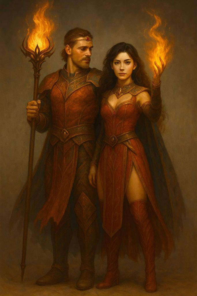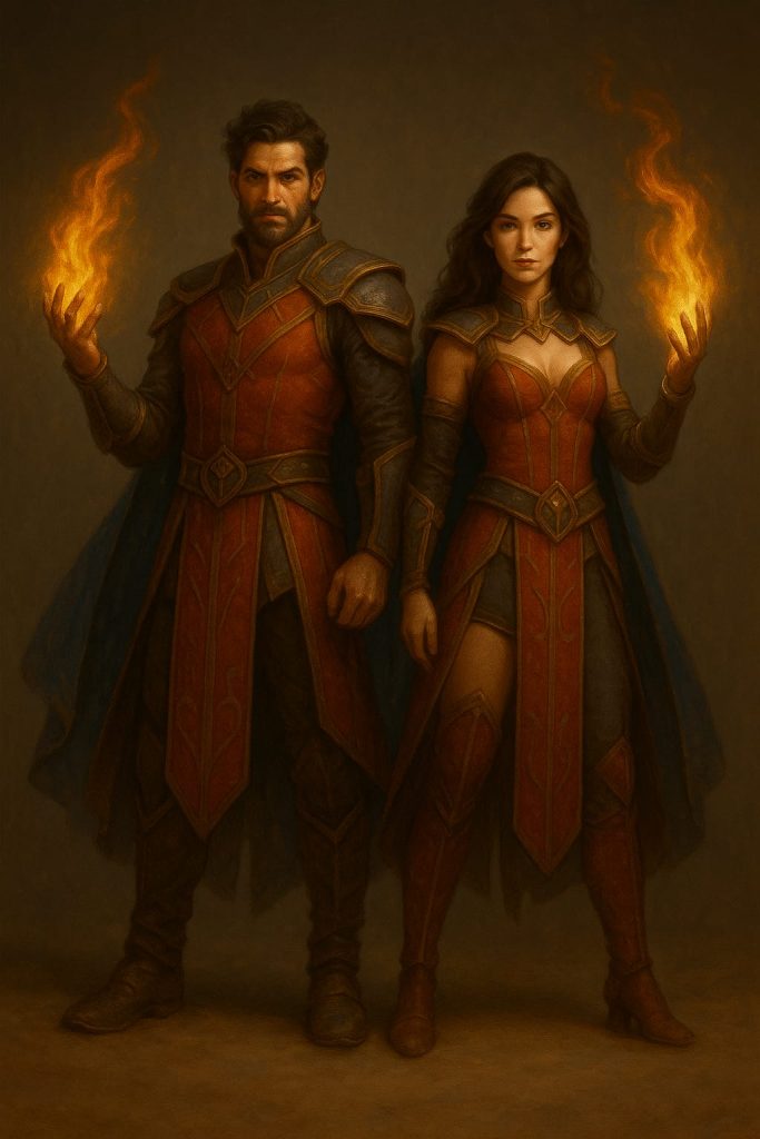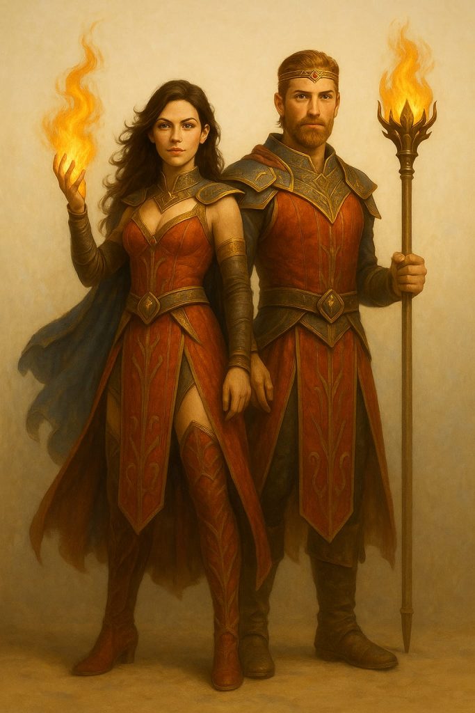 Light–armoured caster silhouette. Long split-robe, high boots, narrow waist, minimal plating. Power reads first — fire or staff-light becomes part of the outline.