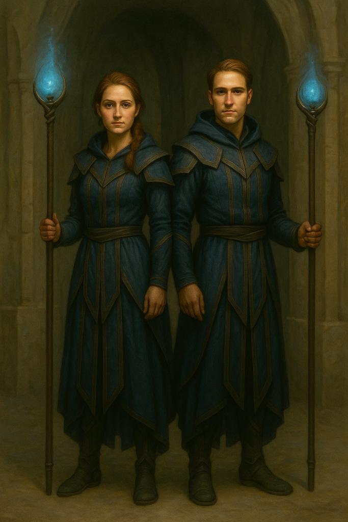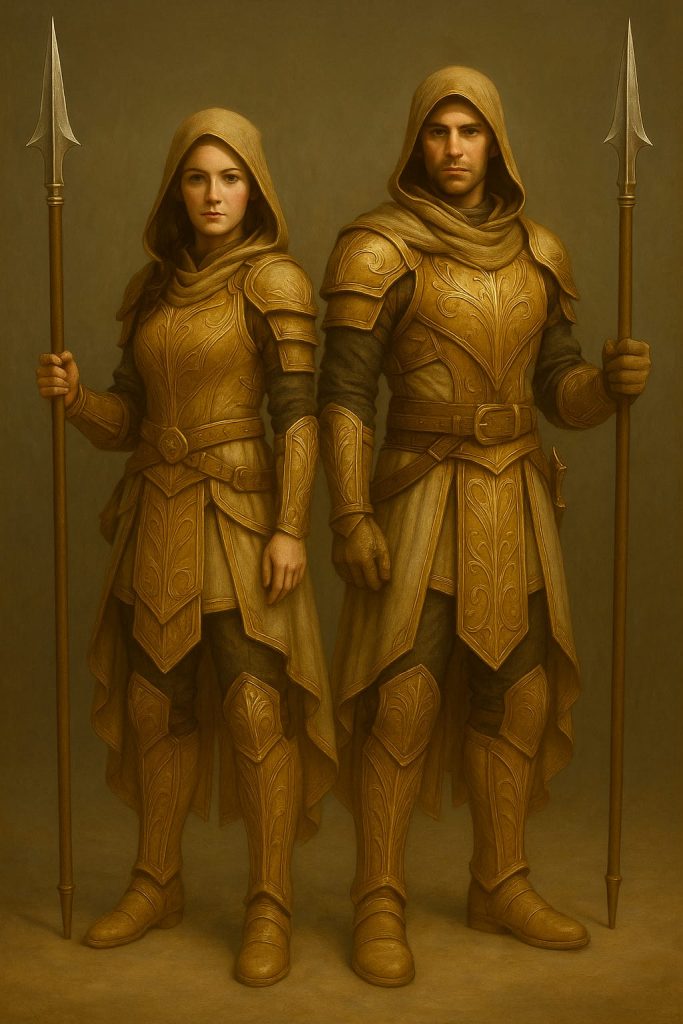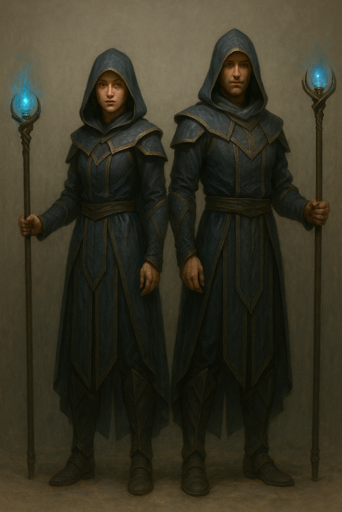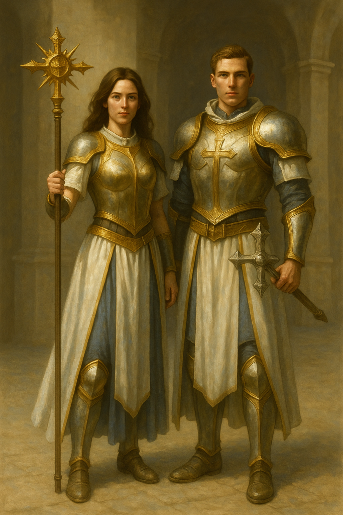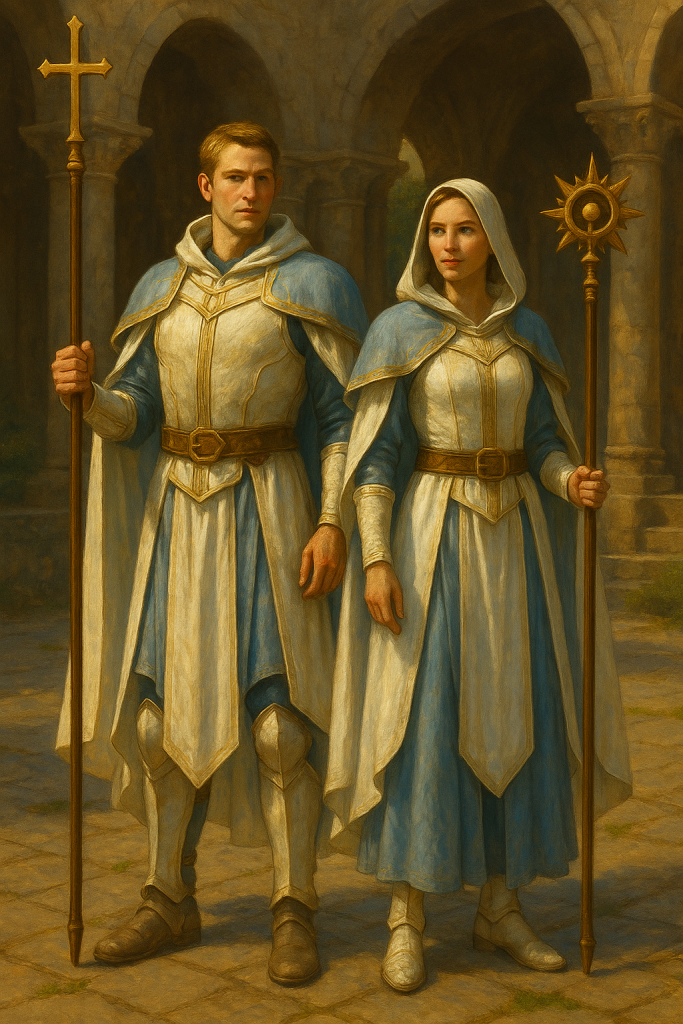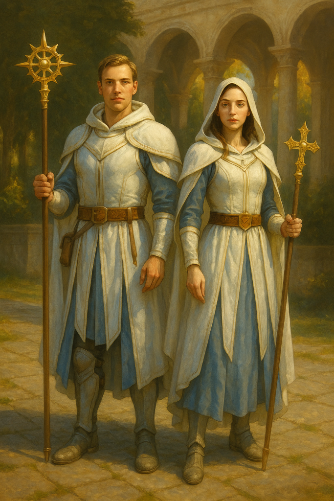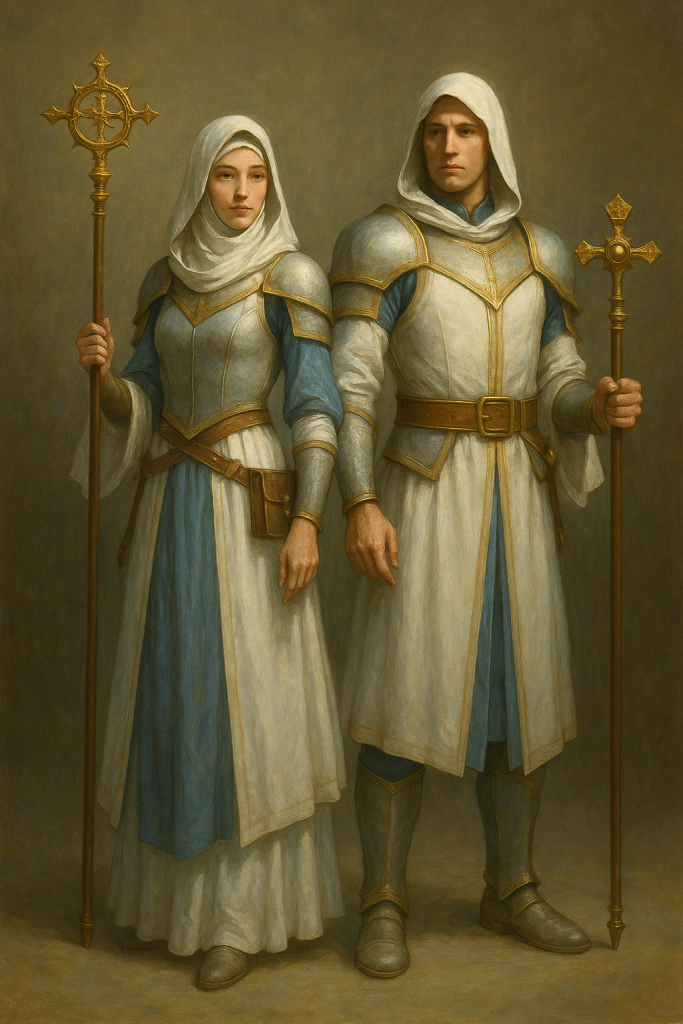 Light armour over layered robes. Soft, vertical lines and hooded profiles. Symbol-topped staves define presence — restorative, steadfast, composed.