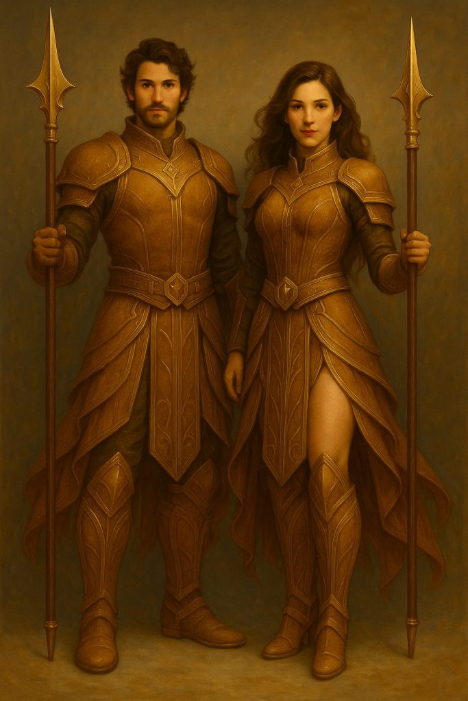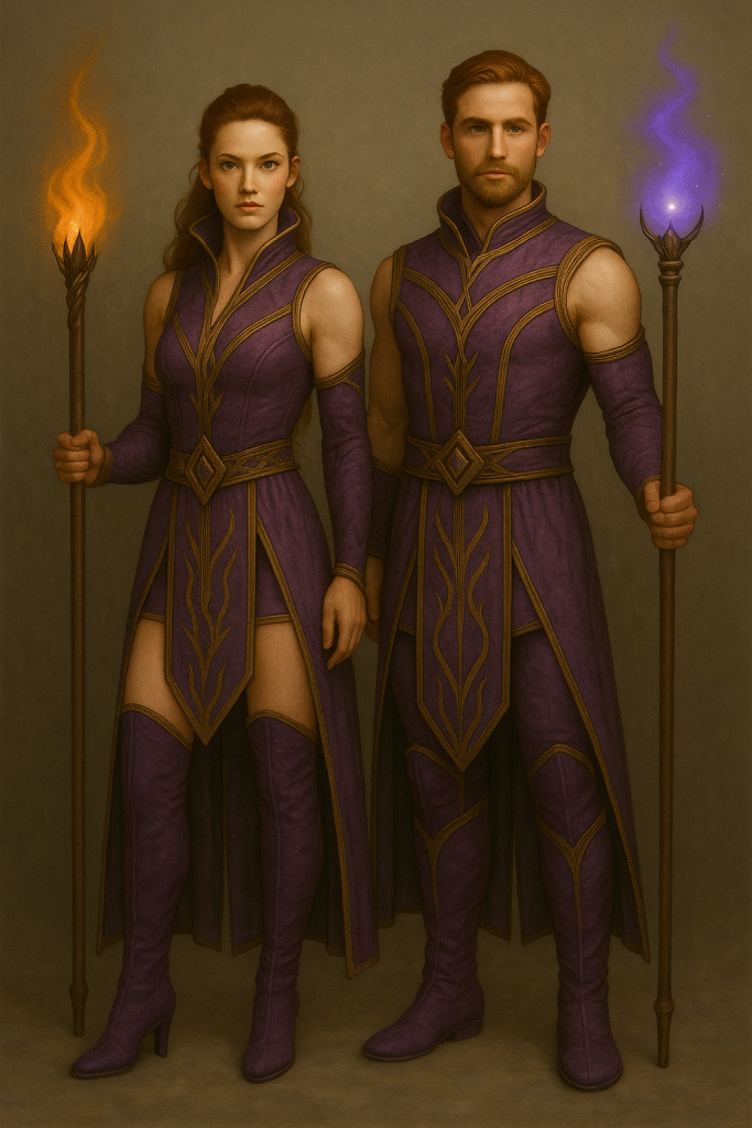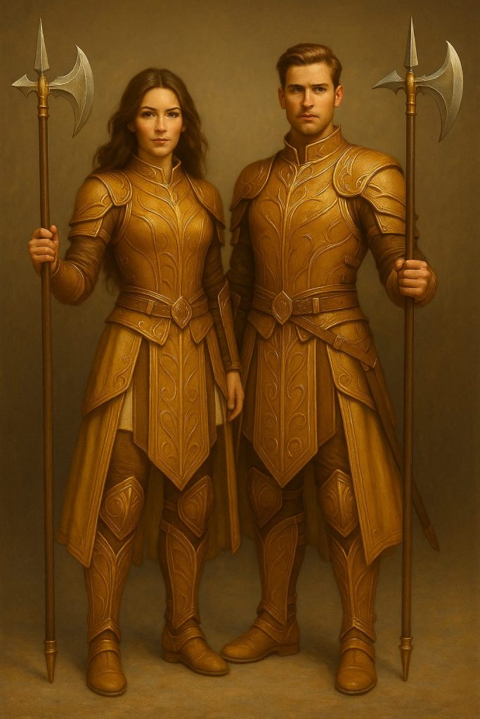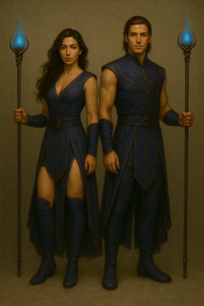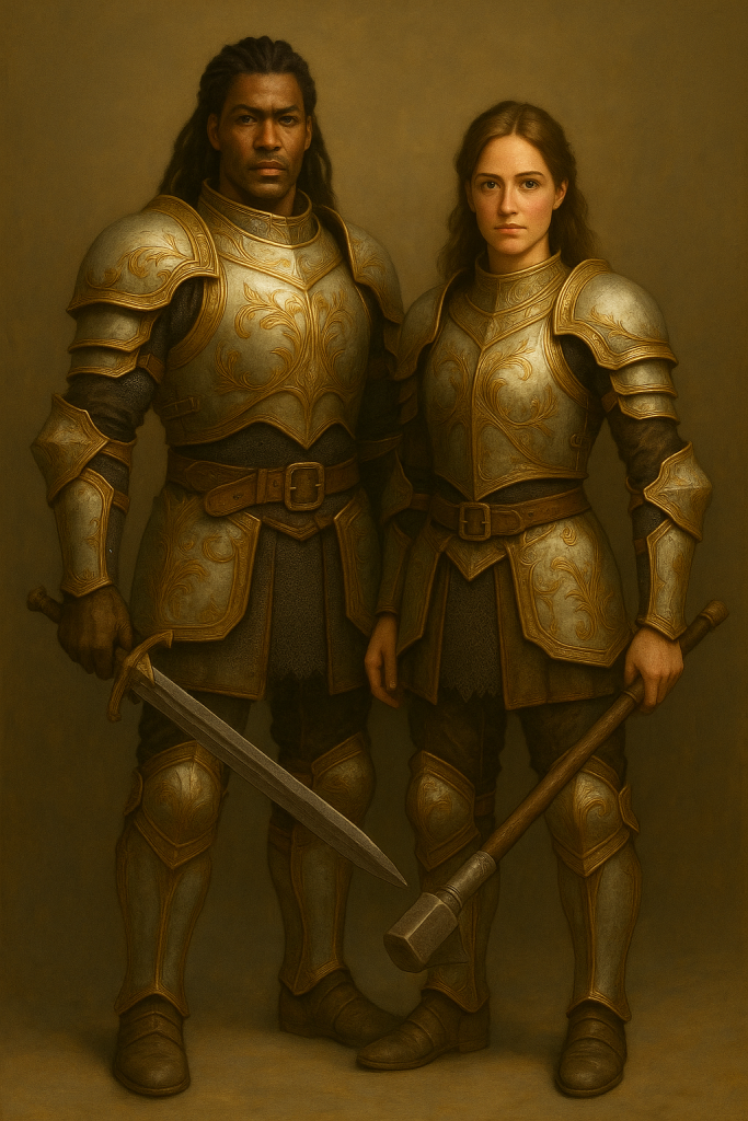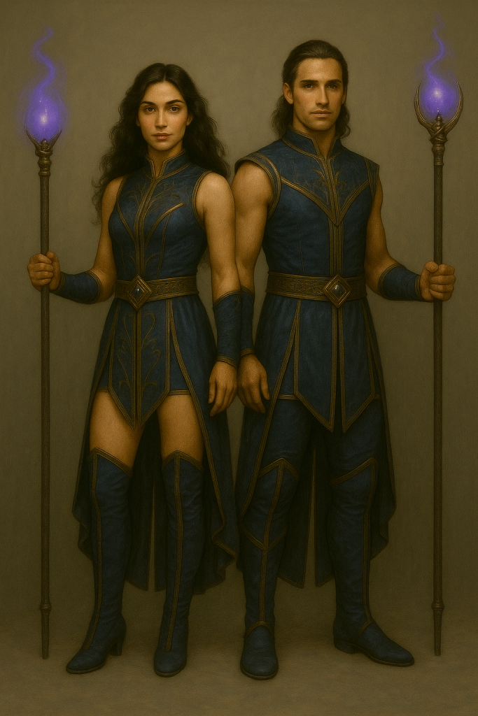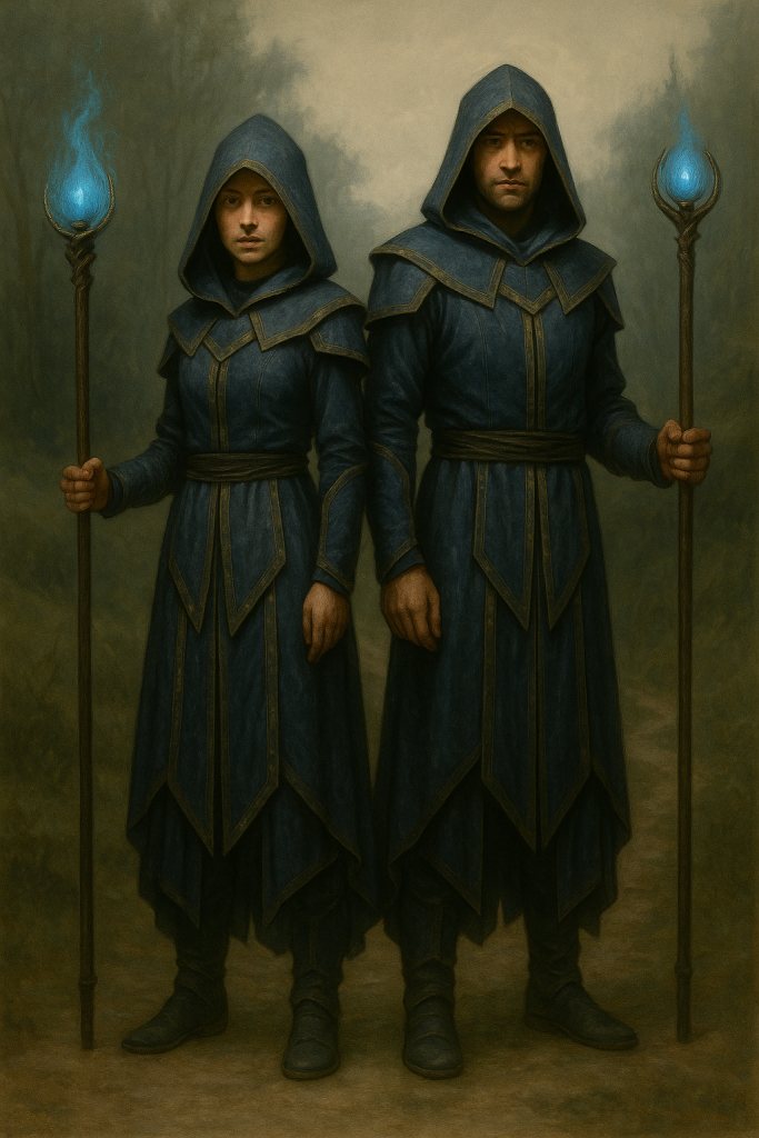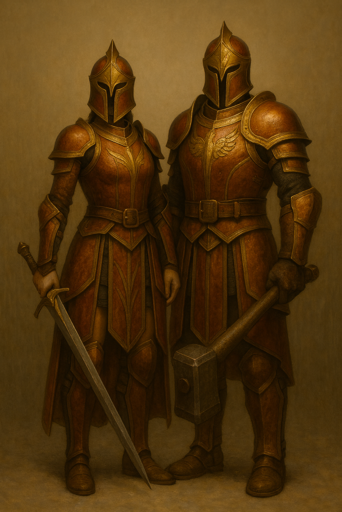 Light armour over layered robes. Soft, vertical lines and hooded profiles. Symbol-topped staves define presence — restorative, steadfast, composed.
