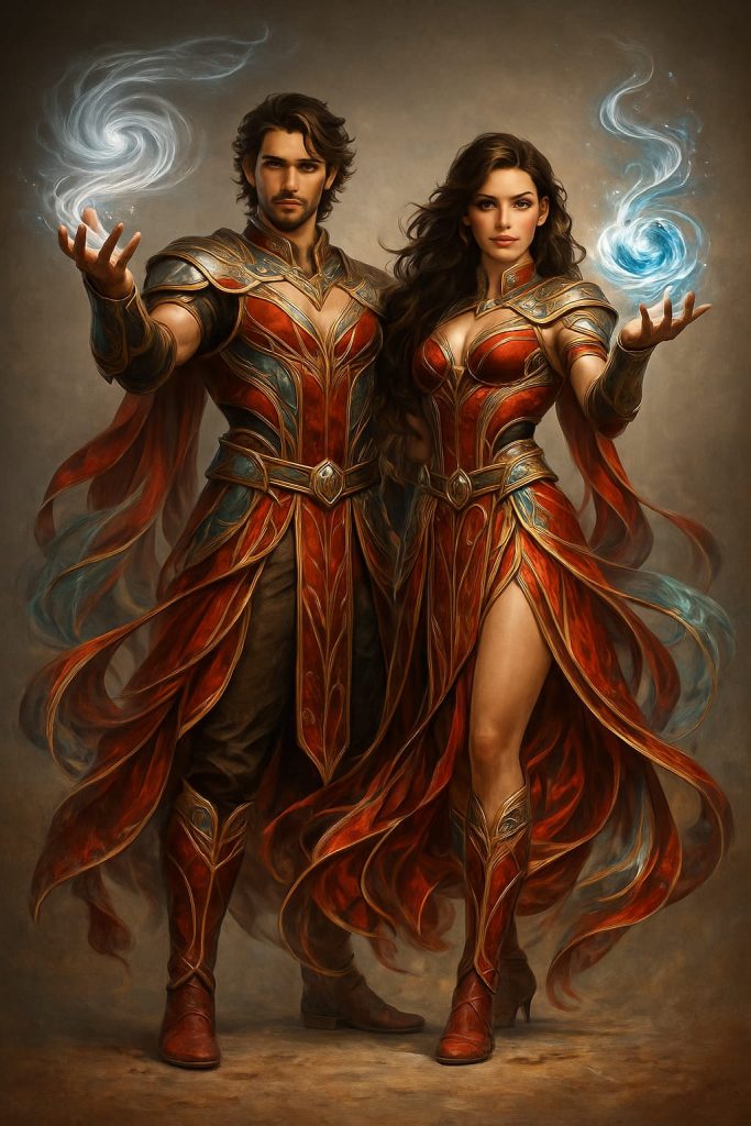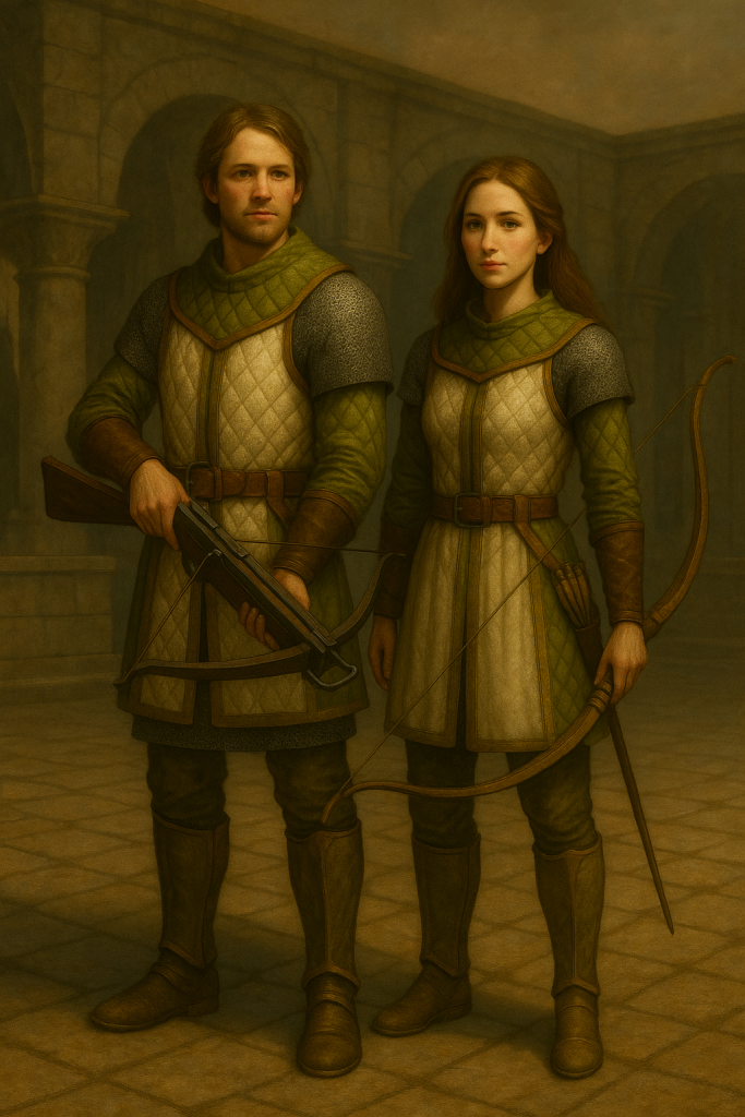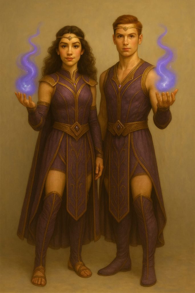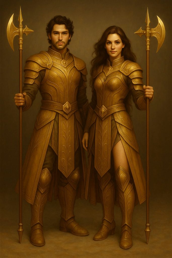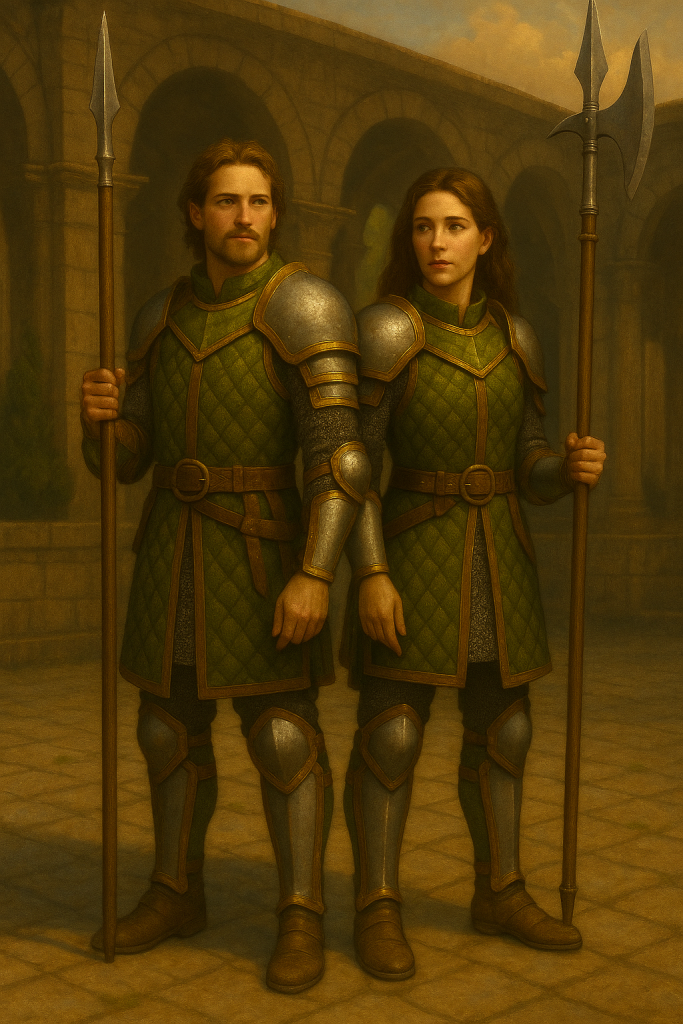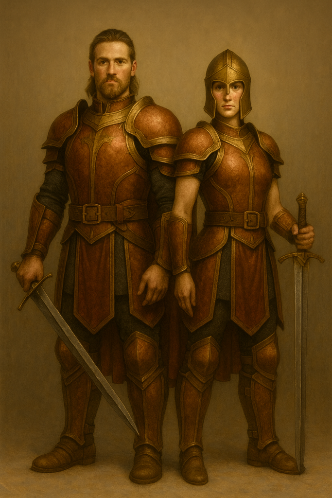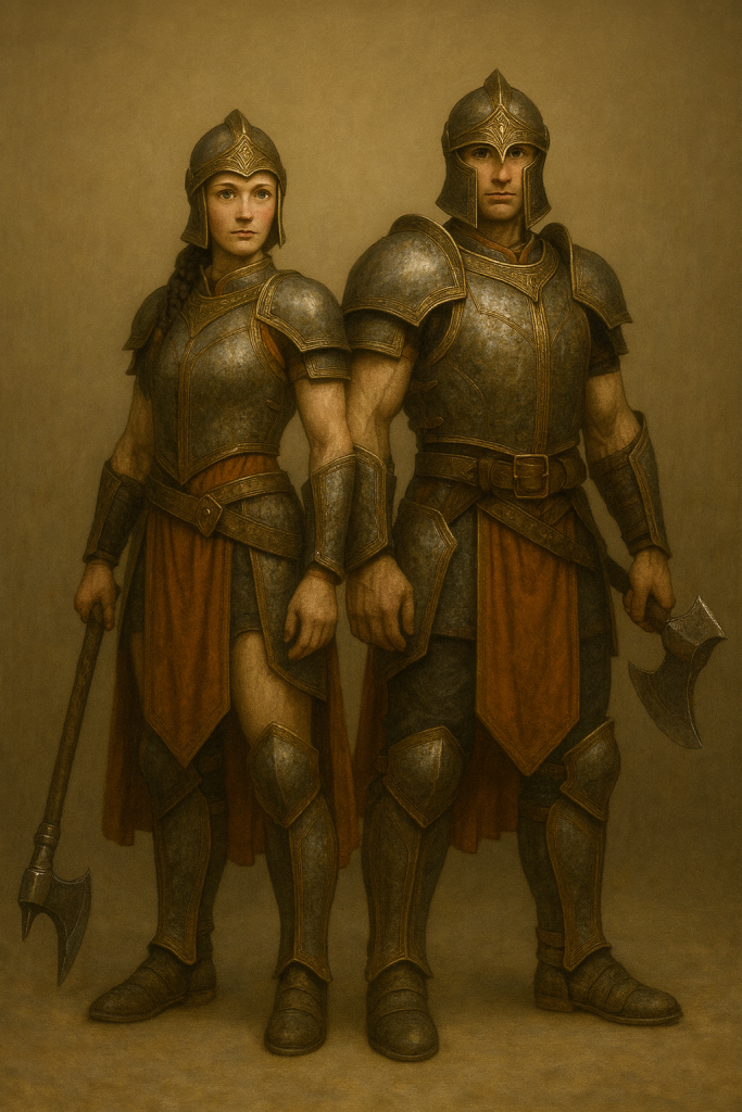 Light armour over layered robes. Soft, vertical lines and hooded profiles. Symbol-topped staves define presence — restorative, steadfast, composed.
