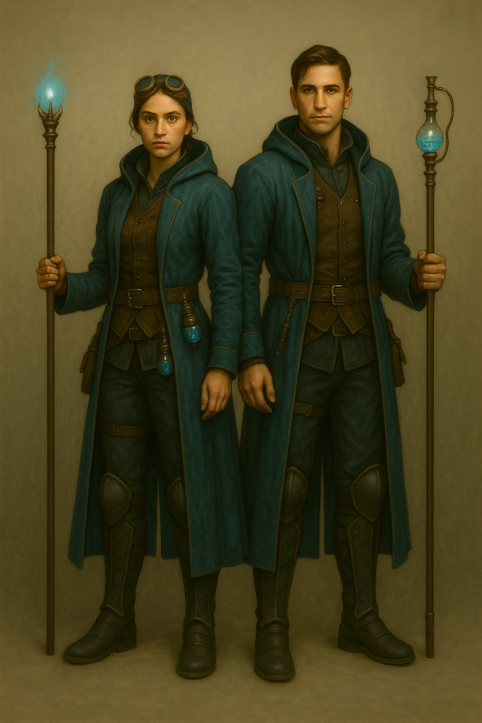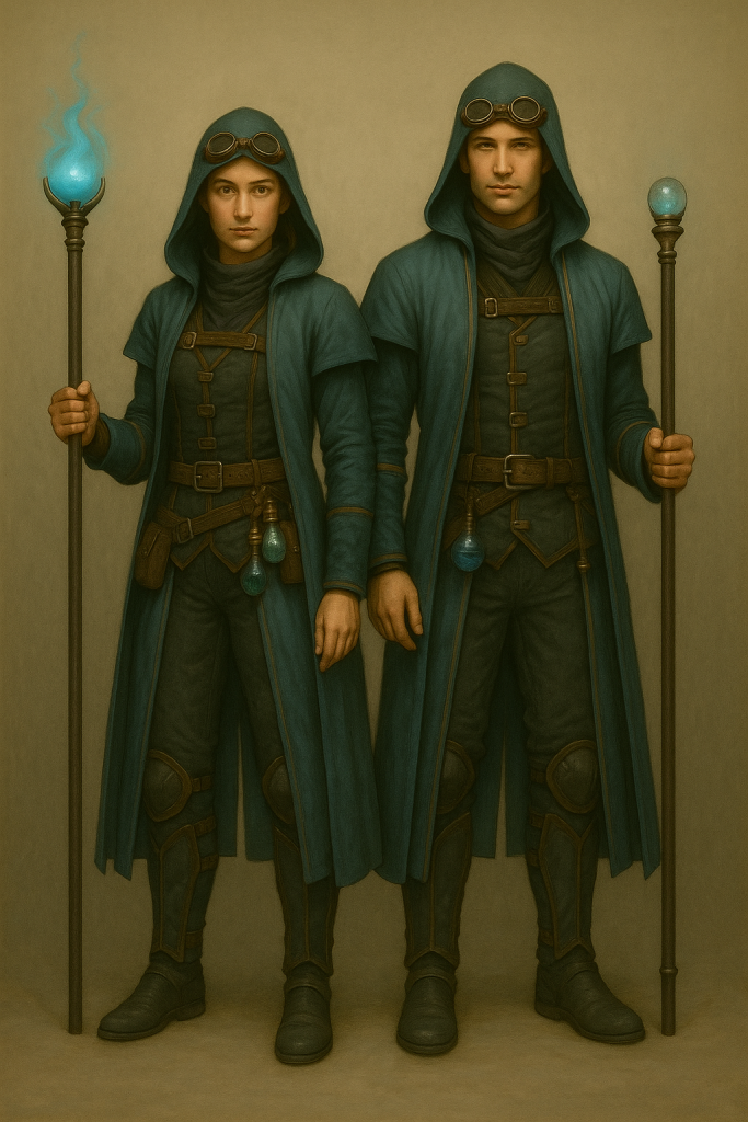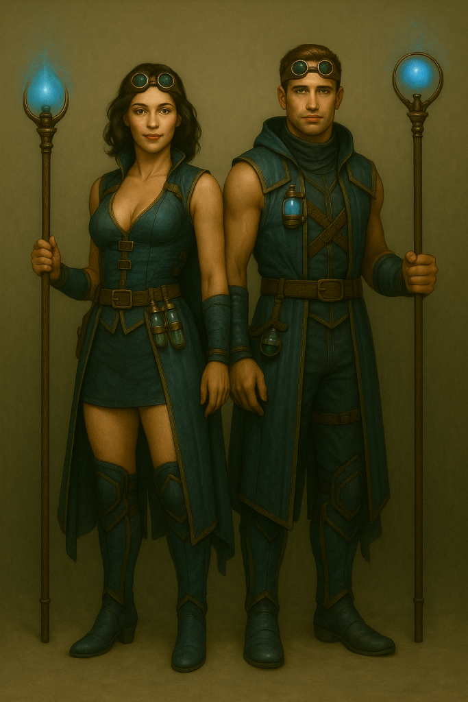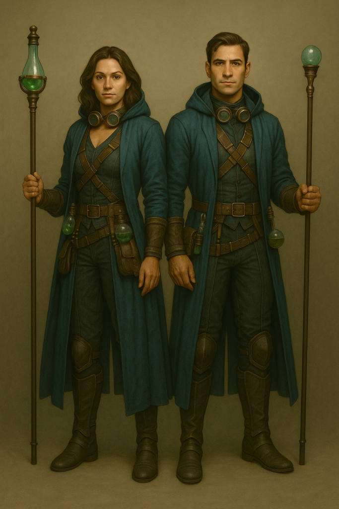 Light–clad magi-artisan.Canvas coats, strapped harness, vials at the belt.Utility first — tools, goggles, reagents define the outline.