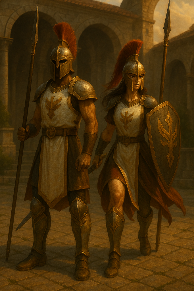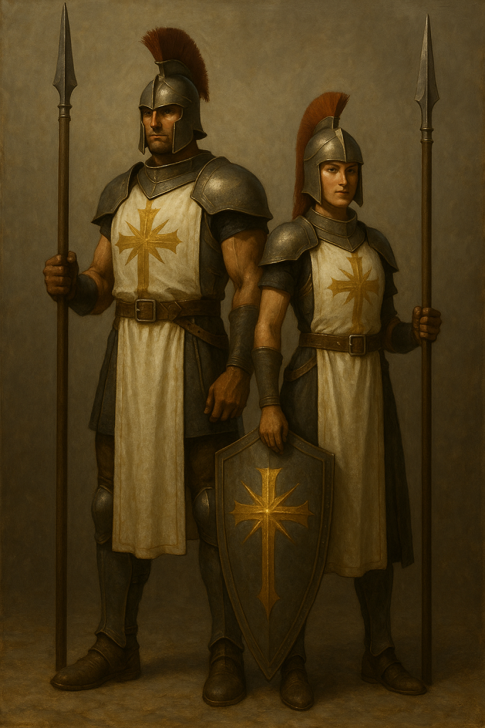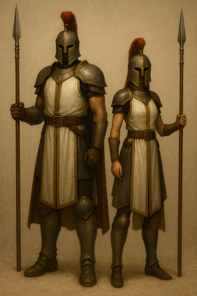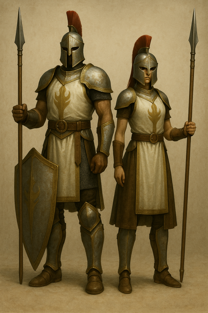 Heavy–armoured vanguard silhouette. Crested helm, plate shoulders, long tabard, spear-and-shield stance. The outline reads disciplined and authoritative — a frontline standard-bearer built to hold formation and direct the line.