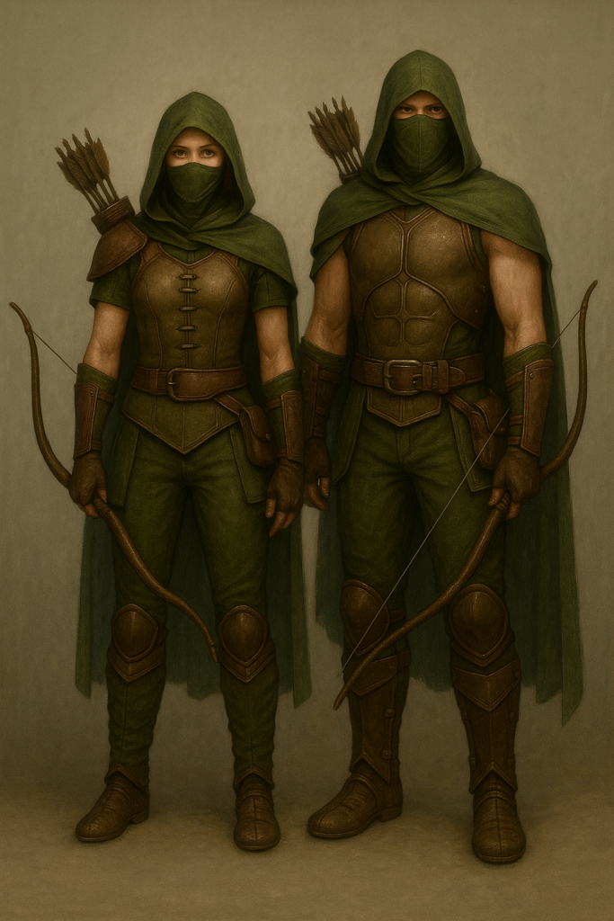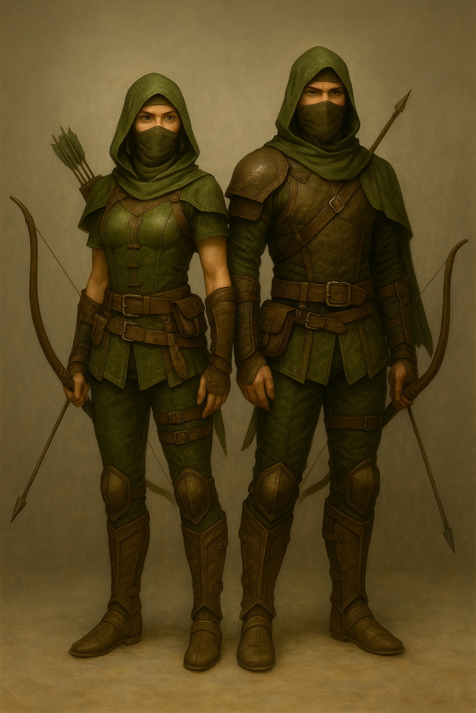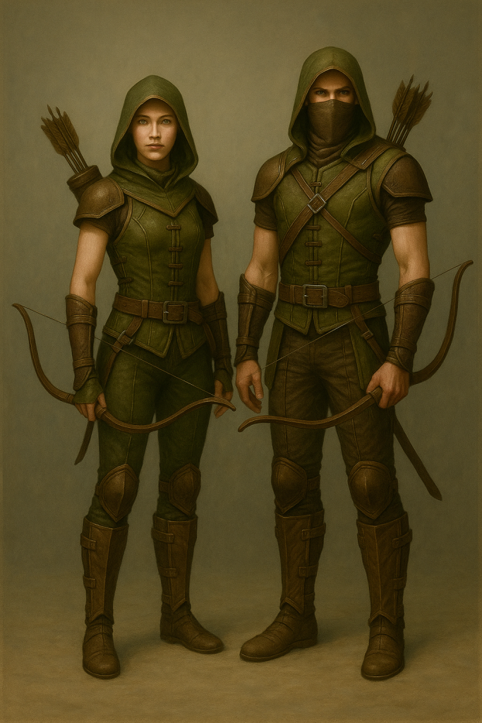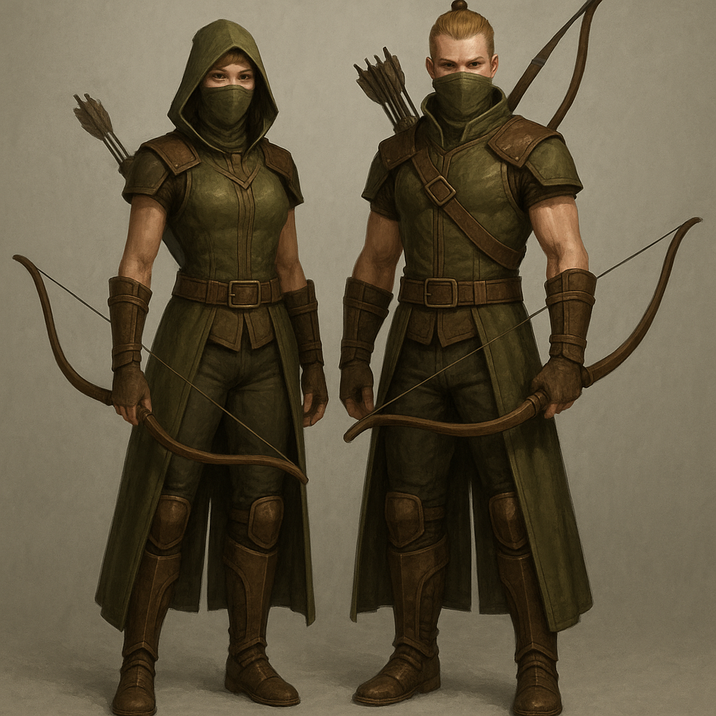 Medium–armoured hunter. Hooded profile, fitted leathers, bracers, and layered shoulder guards. Gear is quiet and practical — quiver, bow, and field kit form the outline. The silhouette reads as a disciplined woods scout rather than a drifter.