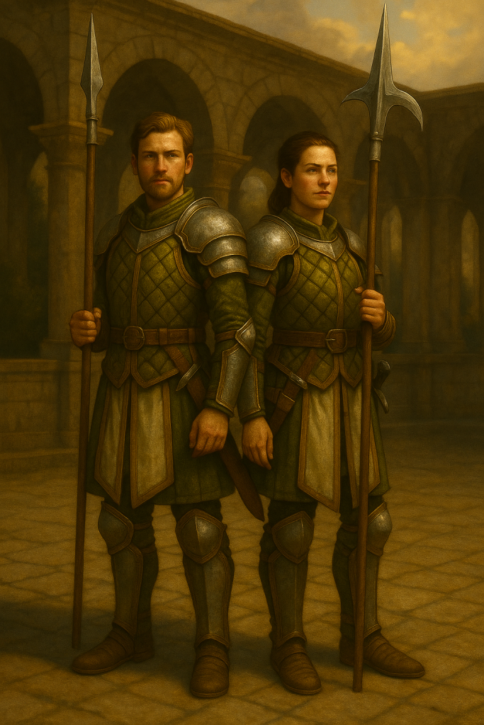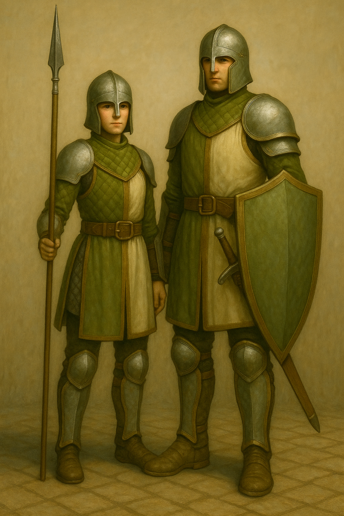 Quilted underlayer, plated shoulders, reinforced greaves. The outline reads disciplined and utilitarian — trained stance, straight lines, built for formation combat rather than flair.