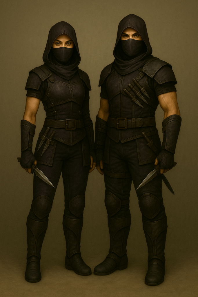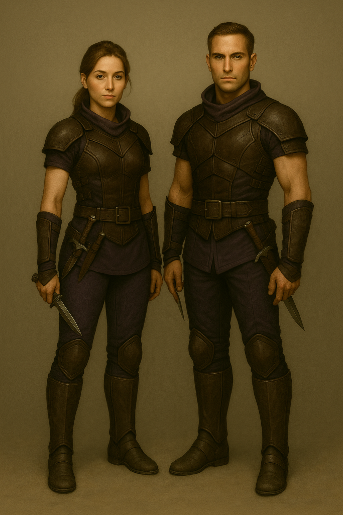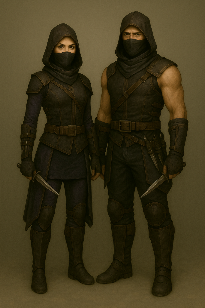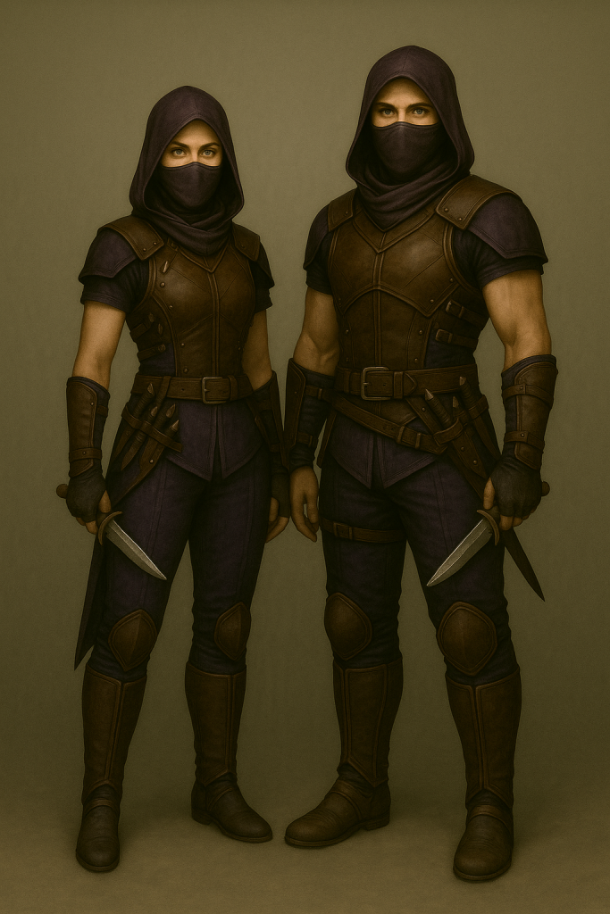Medium–armoured infiltrator silhouette. Layered leather plating, fitted tunic, high boots, hood-first outline. Mobility defines the shape — straps, knives, and compact gear framing a quiet, lethal profile.